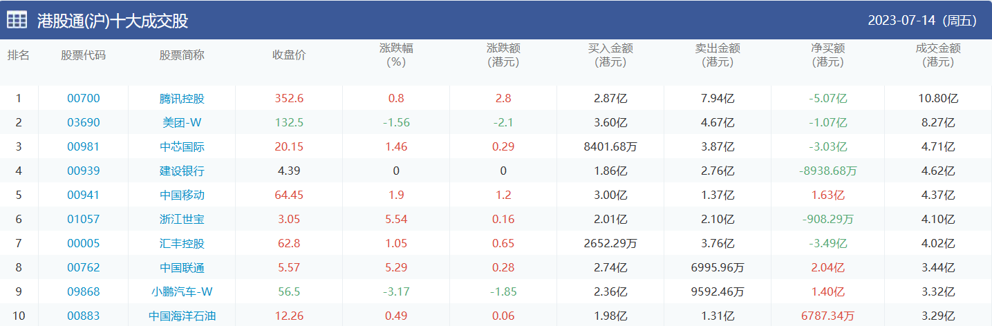 亚汇网实时数据统计:截至7月17日收盘,腾讯控股、美团-w、中芯国际位居港股通(沪)成交前三,腾讯控股、美团-w、中芯国际位居股通(深)成交前三。