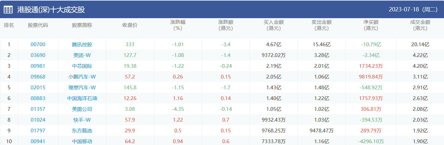 亚汇网实时数据统计:截至7月19日收盘,腾讯控股、美团-w、建设银行位居港股通(沪)成交前三,腾讯控股、美团-w、中芯国际位居股通(深)成交前三。
