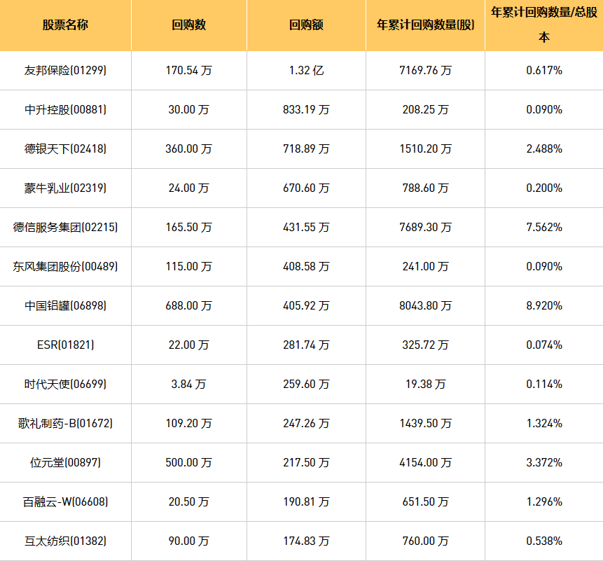 7月21日港股回购概况:互太纺织(01382)、百宏实业(02299)、蒙牛乳业(02319)、兴胜创建(00896)、东亚银行(00023)、中国铝罐(06898)、友邦保险(01299)、普达特科技(00650)、百融云-W(06608)、亿都(国际控股)(00259)、位元堂(00897)、现代牙科(03600)、时代天使(06699)、德银天下(02418)、旭日企业(00393)、东风集团股份(00489)、美亨实业(01897)、圣诺医药-B(02257)、歌礼制药-B(01672)、金科服务(09666)、ESR(01821)、中升控股(00881)、乐声电子(00213)、德信服务集团(02215)于2023年7月20日进行了回购。其中,回购金额最大的为友邦保险(01299),回购数量170.54 万,回购金额1.32 亿元。