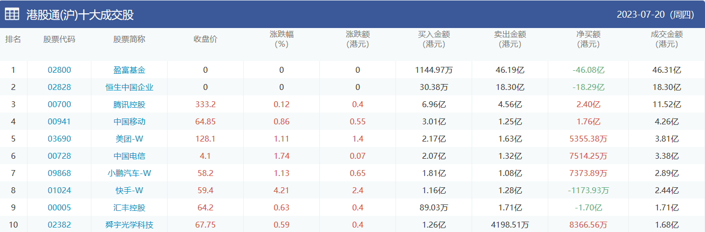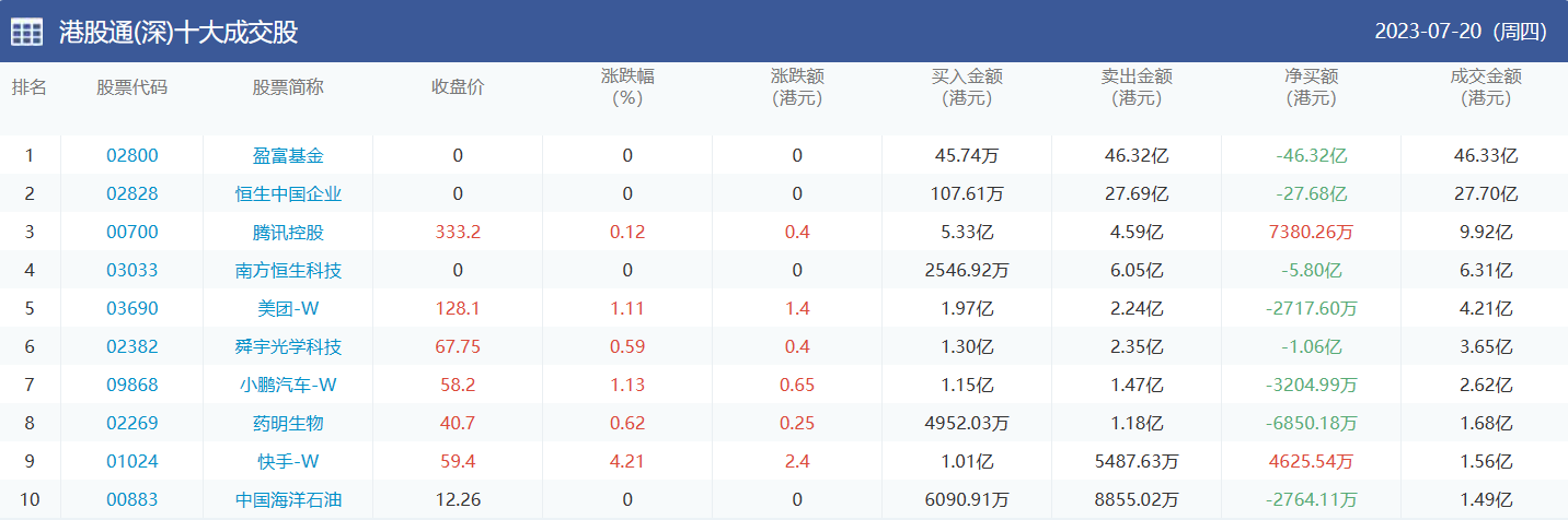 亚汇网实时数据统计:截至7月21日收盘,盈富基金、恒生中国企业、腾讯控股位居港股通(沪)成交前三,盈富基金、恒生中国企业、腾讯控股位居股通(深)成交前三。