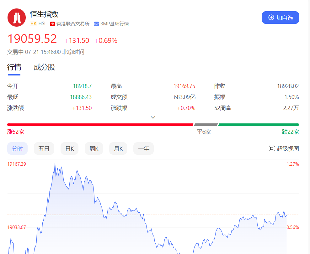 香港恒生指数开盘跌0.05%,早盘恒指小幅低开后震荡走强,盘中一度涨近240点,此后涨幅回落,午后恒指再度走高,呈现“V型”走势。截止收盘,恒生指数涨0.78%或147.24点,报19075.26点,本周累跌1.74%,全日成交额766.23亿港元;恒生国企指数涨0.8%,报6415.02点;恒生科技指数涨1%,报4104.36点。