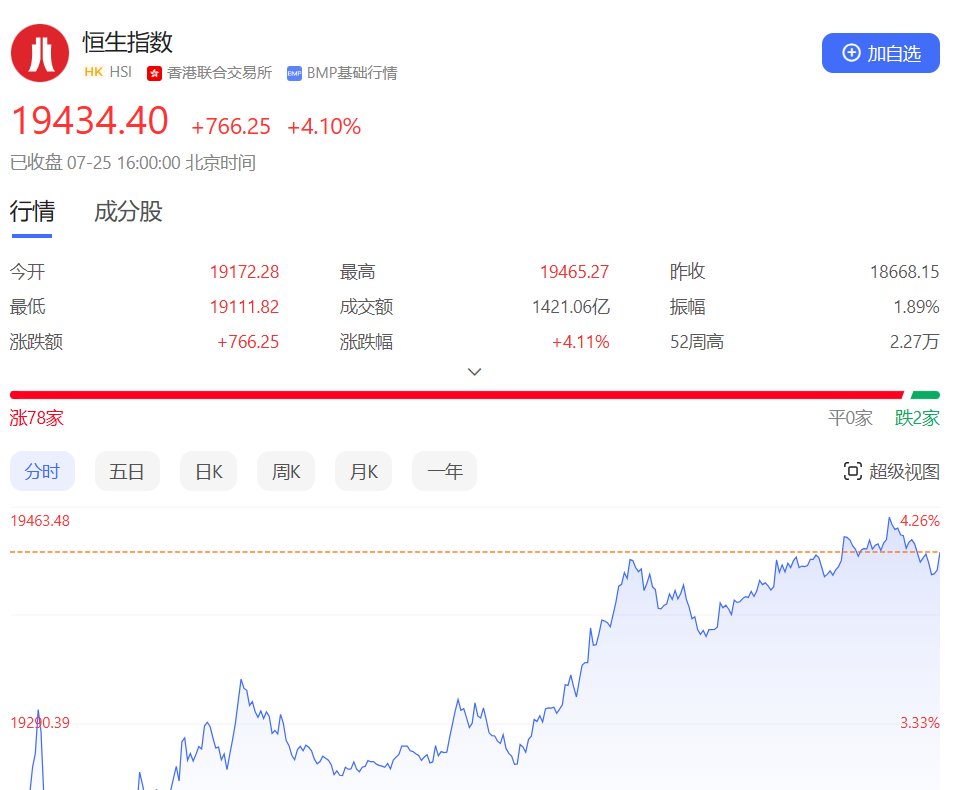 香港恒生指数开盘涨2.7%,三大指数今日集体高开,随后全天维持高位震荡。截止收盘,恒生指数涨4.1%或766.25点,报19434.4点,全日成交额1421.06亿港元;恒生国企指数涨5.31%,报6604.2点;恒生科技指数涨6.04%,报4257.58点。
