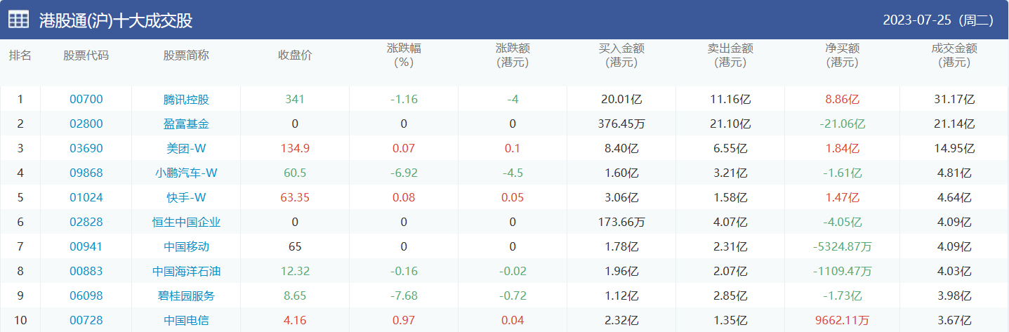 亚汇网实时数据统计:截至7月26日收盘,盈富基金、腾讯控股、盈富基金、美团-w位居港股通(沪)成交前三,恒生中国企业、盈富基金、腾讯控股位居股通(深)成交前三。