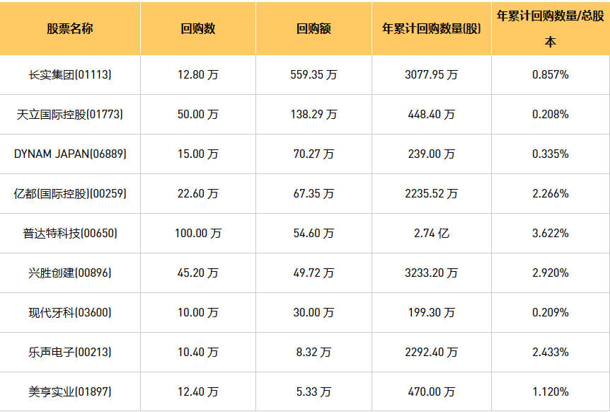 8月8日港股回购概况:DYNAM JAPAN(06889)、普达特科技(00650)、长实集团(01113)、乐声电子(00213)、亿都(国际控股)(00259)、兴胜创建(00896)、现代牙科(03600)、美亨实业(01897)、天立国际控股(01773)于2023年8月7日进行了回购。其中,回购金额最大的为长实集团(01113),回购数量12.80 万,回购金额559.35 万元。