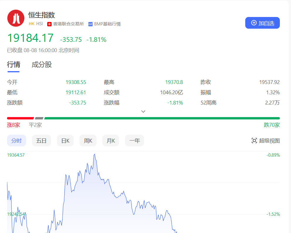 香港恒生指数开盘跌1.17%,三大指数全天弱势运行,恒科指盘中一度跌3%。截止收盘,恒生指数跌1.81%或353.75点,报19184.17点,全日成交额1046.2亿港元;恒生国企指数跌2.18%,报6587.75点;恒生科技指数跌2.78%,报4374.2点。