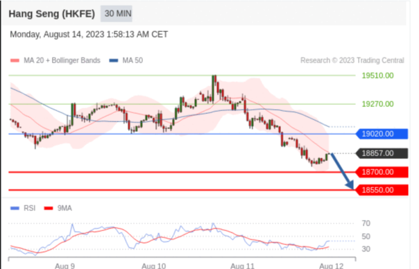 交易策略: 在 19020.00 之下,看跌,目标价位为 18700.00 ,然后为 18550.00 。