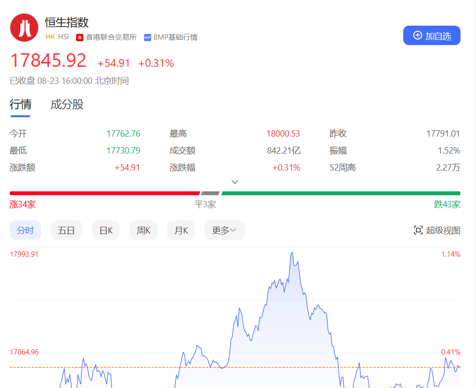 香港恒生指数开盘跌0.16%,早盘恒指低开后呈窄幅震荡走势,午后强势拉升,盘中一度收复一万八关口,但随后显著回落。截止收盘,恒生指数涨0.31%或54.91点,报17845.92点,全日成交额842.21亿港元;恒生国企指数涨0.32%,报6117.27点;恒生科技指数涨0.2%,报4008.86点。