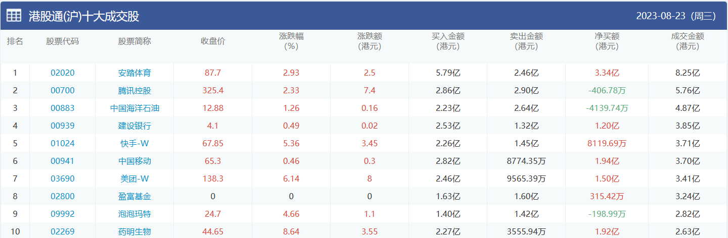 亚汇网实时数据统计:截至8月24日收盘,安踏体育、腾讯控股、中国海洋石油位居港股通(沪)成交前三,、腾讯控股、快手-w、美团-w位居股通(深)成交前三。