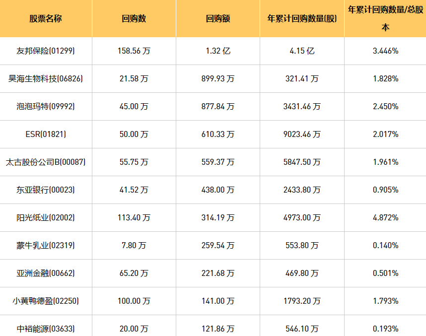 8月25日港股回购概况:永安国际(00289)、天福(06868)、东亚银行(00023)、亚洲金融(00662)、现代牙科(03600)、摩比发展(00947)、泡泡玛特(09992)、太古股份公司B(00087)、昊海生物科技(06826)、中裕能源(03633)、新时代能源(00166)、赛晶科技(00580)、天工国际(00826)、小黄鸭德盈(02250)、乐声电子(00213)、友邦保险(01299)、盛业资本(08469)、中远海运国际(00517)、阳光纸业(02002)、蒙牛乳业(02319)、康圣环球(09960)、ESR(01821)、福森药业(01652)、知乎-W(02390)于2023年5月8日进行了回购。其中,回购金额最大的为友邦保险(01299),回购数量158.56 万,回购金额1.32 亿元。
