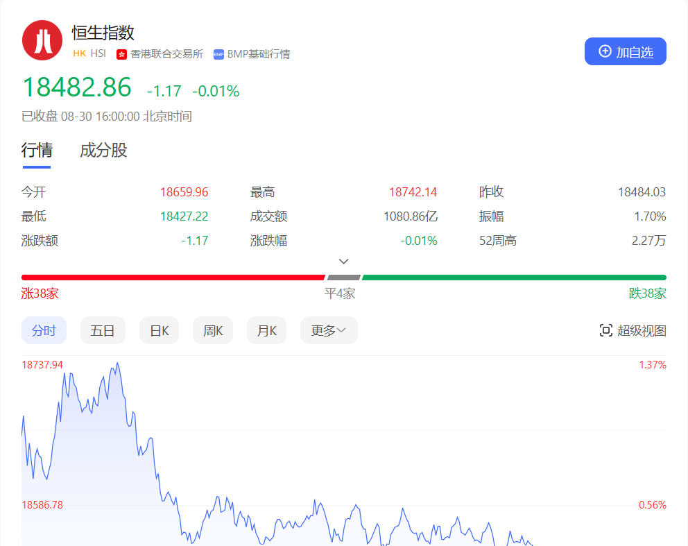 香港恒生指数开盘涨0.95%。三大指数早盘集体高开,随后震荡走弱,并相继翻绿。截止收盘,恒生指数跌0.01%或1.17点,报18482.86点,全日成交额1080.86亿港元;恒生国企指数跌0.47%,报6356.5点;恒生科技指数跌0.92%,报4195.41点。