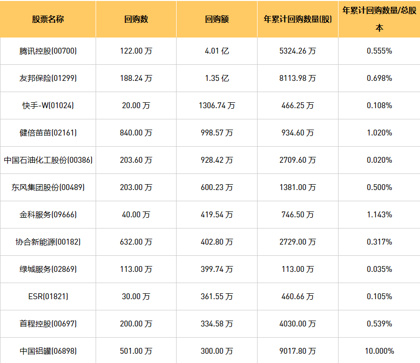8月31日港股回购概况:摩比发展(00947)、资本策略地产(00497)、中国石油化工股份(00386)、东亚银行(00023)、天福(06868)、新鸿基公司(00086)、首佳科技(00103)、中国铝罐(06898)、DYNAM JAPAN(06889)、腾讯控股(00700)、清科创业(01945)、首程控股(00697)、亿都(国际控股)(00259)、友邦保险(01299)、绿城服务(02869)、方达控股(01521)、东风集团股份(00489)、百融云-W(06608)、健倍苗苗(02161)、彩客新能源(01986)、赛晶科技(00580)、天立国际控股(01773)、歌礼制药-B(01672)、创胜集团-B(06628)、同道猎聘(06100)、元征科技(02488)、金科服务(09666)、汇量科技(01860)、快手-W(01024)、ESR(01821)、美丽田园医疗健康(02373)、协合新能源(00182)、乐声电子(00213)、康圣环球(09960)于2023年8月30日进行了回购。其中,回购金额最大的为腾讯控股(00700),回购数量122.00 万,回购金额4.01 亿元。