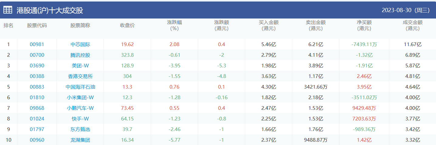 亚汇网实时数据统计:截至8月31日收盘,中芯国际、腾讯控股、美团-w位居港股通(沪)成交前三,美团-w、中芯国际、腾讯控股位居股通(深)成交前三。