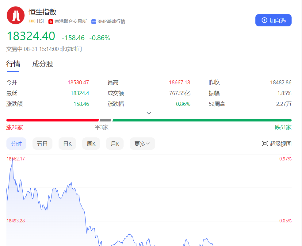 香港恒生指数开盘涨0.53%。三大指数早盘集体高开后震荡下挫,随后相继翻绿,尾盘均小幅收跌。本月,股指明显回吐,恒指跌8.45%,恒国指跌8.22%,恒科指则挫8.14%。截止收盘,恒生指数跌0.55%或100.8点,报18382.06点,全日成交额1365.42亿港元;恒生国企指数跌0.38%,报6332.42点;恒生科技指数跌0.38%,报4179.49点。