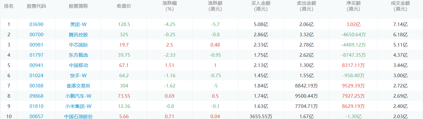 亚汇网9月1日港股通数据统计显示:美团-w净买入额居首,达5.08亿港元,腾讯控股净卖出额居第一位。(亚汇网编辑:静香)