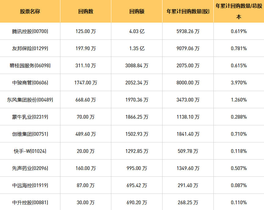 9月8日港股回购概况:伟仕佳杰(00856)、中骏商管(00606)、天福(06868)、首程控股(00697)、摩比发展(00947)、DYNAM JAPAN(06889)、亿胜生物科技(01061)、清科创业(01945)、乐声电子(00213)、东风集团股份(00489)、民银资本(01141)、富智康集团(02038)、先声药业(02096)、新鸿基公司(00086)、昊海生物科技(06826)、友邦保险(01299)、蒙牛乳业(02319)、创维集团(00751)、腾讯控股(00700)、中远海控(0)、碧桂园服务(06098)、彩客新能源(01986)、百融云-W(06608)、星盛商业(06668)、创胜集团-B(06628)、金科服务(09666)、复星国际(00656)、现代牙科(03600)、汇量科技(01860)、赛晶科技(00580)、歌礼制药-B(01672)、固生堂(02273)、诺辉健康(06606)、快手-W(01024)、ESR(01821)、美丽田园医疗健康(02373)、香港科技探索(01137)、同道猎聘(06100)、协合新能源(00182)、天立国际控股(01773)、中升控股(00881)、康圣环球(09960)于2023年9月7日进行了回购。其中,回购金额最大的为腾讯控股(00700),回购数量125.00 万,回购金额4.03 亿元。
