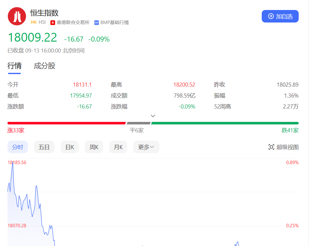 香港恒生指数开盘涨0.58%。早盘恒指高开后小幅冲高,但随即震荡下挫,此后全天呈低位震荡走势。截止收盘,恒生指数跌0.09%或16.67点,报18009.22点,全日成交额798.59亿港元;恒生国企指数跌0.39%,报6235.71点;恒生科技指数跌0.56%,报4041.19点。