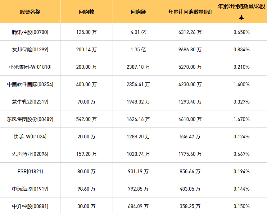 9月14日港股回购概况:伟仕佳杰(00856)、摩比发展(00947)、首程控股(00697)、DYNAM JAPAN(06889)、清科创业(01945)、亿胜生物科技(01061)、新鸿基公司(00086)、绿城服务(02869)、创维集团(00751)、东风集团股份(00489)、天福(06868)、固生堂(02273)、友邦保险(01299)、蒙牛乳业(02319)、首佳科技(00103)、民银资本(01141)、中国软件国际(00354)、彩客新能源(01986)、昊海生物科技(06826)、同道猎聘(06100)、腾讯控股(00700)、中远海控(0)、现代牙科(03600)、先声药业(02096)、歌礼制药-B(01672)、旭日企业(00393)、乐声电子(00213)、希玛眼科(03309)、小米集团-W(01810)、快手-W(01024)、赛晶科技(00580)、中升控股(00881)、ESR(01821)、香港科技探索(01137)、康圣环球(09960)、移卡(09923)、思派健康(00314)、天立国际控股(01773)、星盛商业(06668)、美丽田园医疗健康(02373)于2023年9月13日进行了回购。其中,回购金额最大的为腾讯控股(00700),回购数量125.00 万,回购金额4.01 亿元。