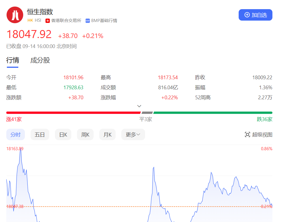 香港恒生指数开盘涨0.51%。早盘恒指高开后一度冲高,但随即回落倒跌;恒指午后V型转涨,尾盘涨幅有所收窄。截止收盘,恒生指数涨0.21%或38.7点,报18047.92点,全日成交额816.04亿港元;恒生国企指数涨0.63%,报6275.15点;恒生科技指数涨0.44%,报4059.15点。