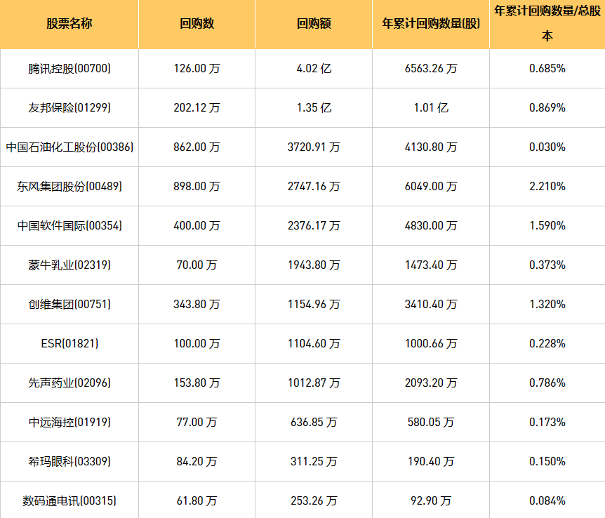 9月18日港股回购概况:中国淀粉(03838)、摩比发展(00947)、首佳科技(00103)、亿胜生物科技(01061)、富智康集团(02038)、天福(06868)、DYNAM JAPAN(06889)、亚洲金融(00662)、蒙牛乳业(02319)、百宏实业(02299)、首程控股(00697)、清科创业(01945)、创维集团(00751)、希玛眼科(03309)、中国石油化工股份(00386)、先声药业(02096)、新鸿基公司(00086)、中国软件国际(00354)、腾讯控股(00700)、中远海控(0)、友邦保险(01299)、东风集团股份(00489)、彩客新能源(01986)、乐声电子(00213)、歌礼制药-B(01672)、昊海生物科技(06826)、旭日企业(00393)、现代牙科(03600)、赛晶科技(00580)、数码通电讯(00315)、思派健康(00314)、康圣环球(09960)、汇量科技(01860)、ESR(01821)、永达汽车(03669)于2023年9月15日进行了回购。其中,回购金额最大的为腾讯控股(00700),回购数量126.00 万,回购金额4.02 亿元。