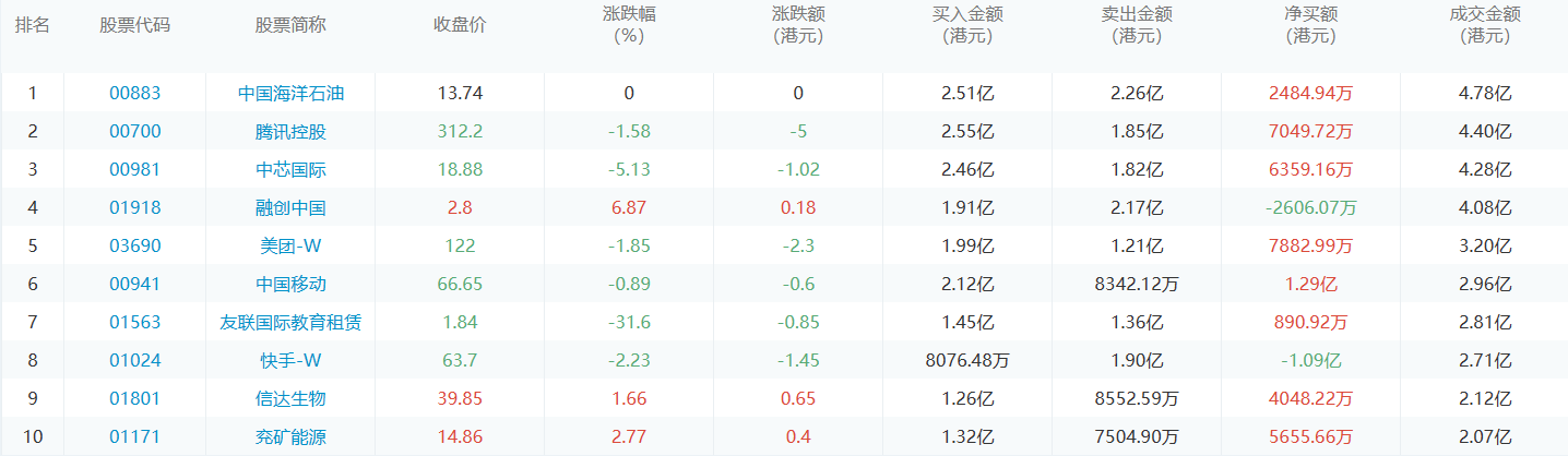 亚汇网9月18日港股通数据统计显示:腾讯控股净买入额居首,达2.55亿港元,中国海洋石油净卖出额居第一位。