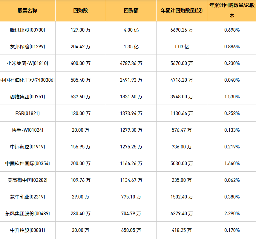 9月19日港股回购概况:晨讯科技(02000)、摩比发展(00947)、新鸿基公司(00086)、蒙牛乳业(02319)、中国石油化工股份(00386)、富智康集团(02038)、美高梅中国(02282)、澳能建设(01183)、亿胜生物科技(01061)、创维集团(00751)、中国软件国际(00354)、东风集团股份(00489)、歌礼制药-B(01672)、百融云-W(06608)、腾讯控股(00700)、先声药业(02096)、希玛眼科(03309)、天福(06868)、首程控股(00697)、中远海控(0)、创梦天地(01119)、赛晶科技(00580)、金山软件(03888)、昊海生物科技(06826)、彩客新能源(01986)、友邦保险(01299)、现代牙科(03600)、旭日企业(00393)、小米集团-W(01810)、思派健康(00314)、复星国际(00656)、快手-W(01024)、中升控股(00881)、汇量科技(01860)、永达汽车(03669)、康圣环球(09960)、美丽田园医疗健康(02373)、伟仕佳杰(00856)、乐声电子(00213)、ESR(01821)于2023年9月18日进行了回购。其中,回购金额最大的为腾讯控股(00700),回购数量127.00 万,回购金额4.00 亿元。