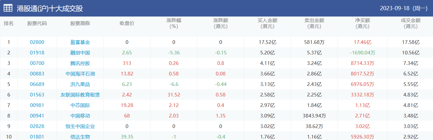 亚汇网实时数据统计:截至9月19日收盘,盈富基金、融创中国、腾讯控股位居港股通(沪)成交前三,盈富基金、融创中国、南方恒生科技位居股通(深)成交前三。