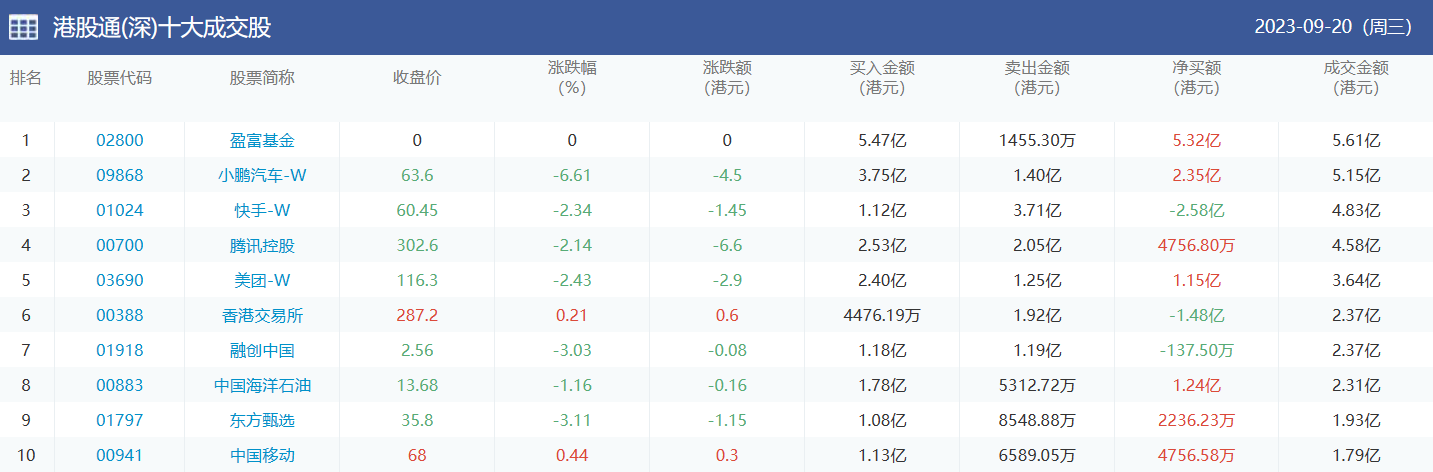 亚汇网实时数据统计:截至9月21日收盘,腾讯控股、美团-w、融创中国位居港股通(沪)成交前三,盈富基金、小鹏汽车、快手-w位居股通(深)成交前三。