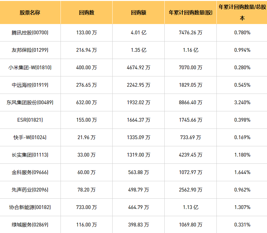 9月27日港股回购概况:富智康集团(02038)、摩比发展(00947)、永安国际(00289)、首佳科技(00103)、亿胜生物科技(01061)、DYNAM JAPAN(06889)、新鸿基公司(00086)、清科创业(01945)、绿城服务(02869)、天福(06868)、百宏实业(02299)、民银资本(01141)、腾讯控股(00700)、东风集团股份(00489)、金科服务(09666)、歌礼制药-B(01672)、先声药业(02096)、亿都(国际控股)(00259)、中远海控(0)、汇量科技(01860)、赛晶科技(00580)、长实集团(01113)、友邦保险(01299)、协合新能源(00182)、旭日企业(00393)、思派健康(00314)、数码通电讯(00315)、小米集团-W(01810)、现代牙科(03600)、ESR(01821)、快手-W(01024)、复星国际(00656)、天立国际控股(01773)、永达汽车(03669)、加科思-B(01167)、康圣环球(09960)于2023年9月26日进行了回购。其中,回购金额最大的为腾讯控股(00700),回购数量133.00 万,回购金额4.01 亿元。