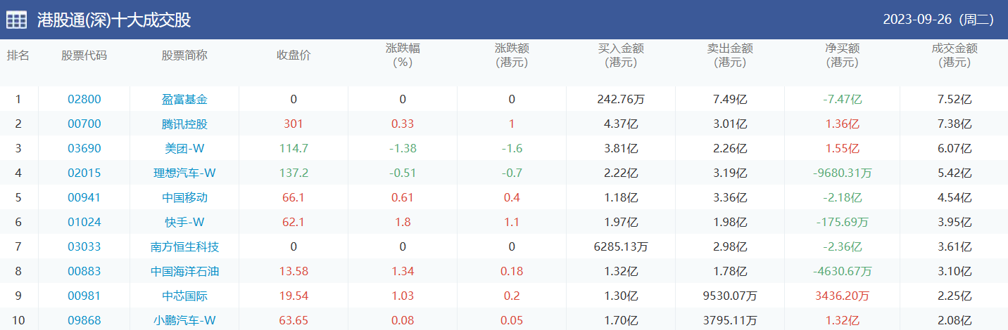 亚汇网实时数据统计:截至9月27日收盘,盈富基金、腾讯控股、恒生中国企业位居港股通(沪)成交前三,盈富基金、腾讯控股、美团-w位居股通(深)成交前三。