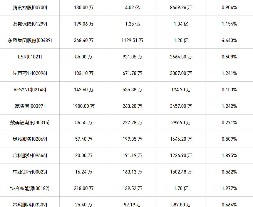 10月11日港股回购概况:新鸿基公司(00086)、摩比发展(00947)、天福(06868)、金科服务(09666)、腾讯控股(00700)、亿胜生物科技(01061)、希玛眼科(03309)、首佳科技(00103)、清科创业(01945)、科联系统(00046)、亿都(国际控股)(00259)、民银资本(01141)、友邦保险(01299)、创胜集团-B(06628)、东亚银行(00023)、现代牙科(03600)、嬴集团(00397)、中国旺旺(00151)、复星国际(00656)、旭日企业(00393)、歌礼制药-B(01672)、赛晶科技(00580)、ESR(01821)、小米集团-W(01810)、汇量科技(01860)、VESYNC(02148)、协合新能源(00182)、康圣环球(09960)于2023年10月9日进行了回购。其中,回购金额最大的为腾讯控股(00700),回购数量131.00 万,回购金额4.02 亿元。