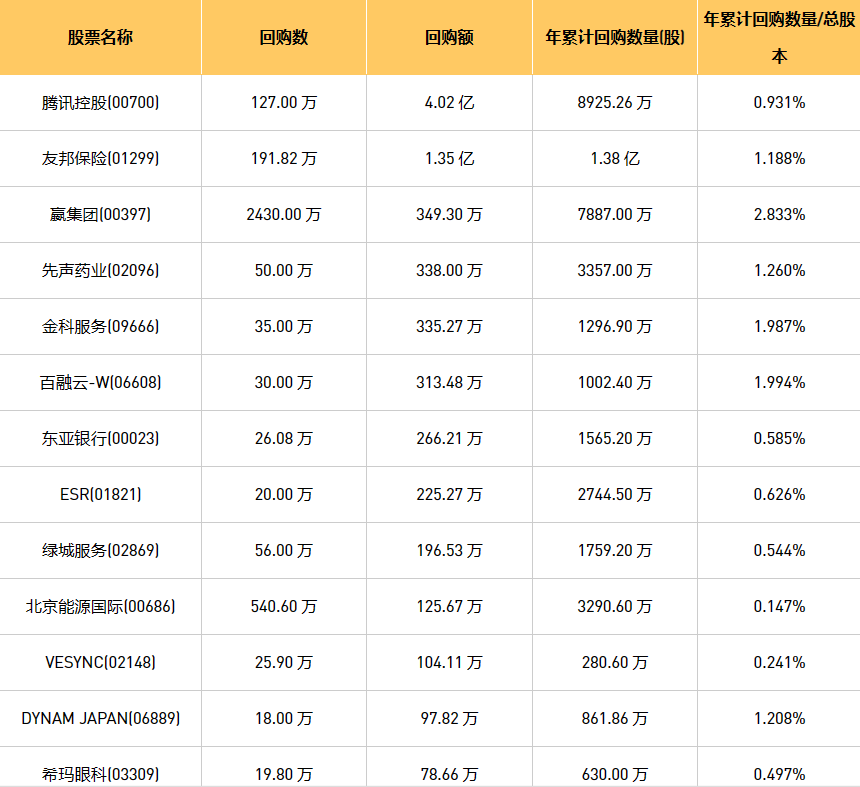 10月13日港股回购概况:希玛眼科(03309)、摩比发展(00947)、绿城服务(02869)、DYNAM JAPAN(06889)、科联系统(00046)、天福(06868)、东亚银行(00023)、首佳科技(00103)、清科创业(01945)、金科服务(09666)、歌礼制药-B(01672)、北京能源国际(00686)、先声药业(02096)、创胜集团-B(06628)、亿都(国际控股)(00259)、友邦保险(01299)、德银天下(02418)、腾讯控股(00700)、创梦天地(01119)、VESYNC(02148)、彩客新能源(01986)、百融云-W(06608)、旭日企业(00393)、现代牙科(03600)、嬴集团(00397)、赛晶科技(00580)、思派健康(00314)、汇量科技(01860)、康圣环球(09960)、协合新能源(00182)、ESR(01821)于2023年10月12日进行了回购。其中,回购金额最大的为腾讯控股(00700),回购数量127.00 万,回购金额4.02 亿元。