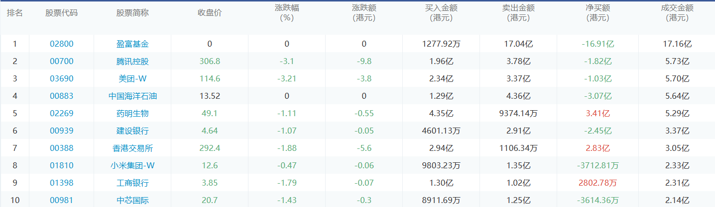 亚汇网10月13日港股通数据统计显示:药明生物净买入额居首,达4.35亿港元,盈富基金净卖出额居第一位。