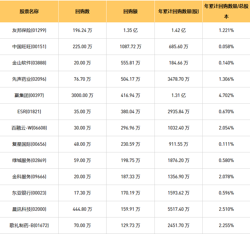 10月17日港股回购概况:伟仕佳杰(00856)、希玛眼科(03309)、天福(06868)、晨讯科技(02000)、东亚银行(00023)、创梦天地(01119)、友邦保险(01299)、绿城服务(02869)、科联系统(00046)、中国旺旺(00151)、VESYNC(02148)、百融云-W(06608)、复星国际(00656)、金科服务(09666)、嬴集团(00397)、创胜集团-B(06628)、先声药业(02096)、彩客新能源(01986)、亿都(国际控股)(00259)、歌礼制药-B(01672)、德银天下(02418)、金山软件(03888)、赛晶科技(00580)、旭日企业(00393)、ESR(01821)、香港科技探索(01137)、现代牙科(03600)、康圣环球(09960)于2023年10月16日进行了回购。其中,回购金额最大的为友邦保险(01299),回购数量196.24 万,回购金额1.35 亿元。
