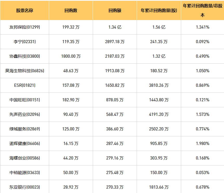 10月27日港股回购概况: 先声药业(02096)、绿城服务(02869)、天福(06868)、东亚银行(00023)、李宁(02331)、亿胜生物科技(01061)、友邦保险(01299)、首佳科技(00103)、中国旺旺(00151)、亿都(国际控股)(00259)、歌礼制药-B(01672)、固生堂(02273)、昊海生物科技(06826)、亚洲联合基建控股(00711)、现代牙科(03600)、美因基因(06667)、德银天下(02418)、诺辉健康(06606)、协鑫科技(03800)、中裕能源(03633)、彩客新能源(01986)、旭日企业(00393)、嬴集团(00397)、中石化炼化工程(02386)、香港科技探索(01137)、乐声电子(00213)、海螺创业(00586)、ESR(01821)、复星国际(00656)、中电光谷(00798)、康圣环球(09960)、瑞尔集团(06639)、维亚生物(01873)、海伦司(09869)于2023年10月26日进行了回购。其中,回购金额最大的为友邦保险(01299),回购数量199.32 万,回购金额1.34 亿元。