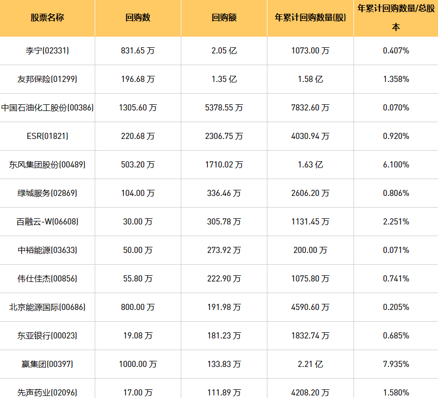 10月30日港股回购概况:科联系统(00046)、伟仕佳杰(00856)、亿胜生物科技(01061)、亚洲金融(00662)、清科创业(01945)、李宁(02331)、绿城服务(02869)、天福(06868)、东亚银行(00023)、摩比发展(00947)、中国旺旺(00151)、中国石油化工股份(00386)、先声药业(02096)、友邦保险(01299)、嬴集团(00397)、赛晶科技(00580)、乐声电子(00213)、亿都(国际控股)(00259)、创胜集团-B(06628)、歌礼制药-B(01672)、旭日企业(00393)、固生堂(02273)、亚洲联合基建控股(00711)、民银资本(01141)、东风集团股份(00489)、ESR(01821)、中石化炼化工程(02386)、瑞尔集团(06639)、百融云-W(06608)、中裕能源(03633)、北京能源国际(00686)、海伦司(09869)于2023年10月27日进行了回购。其中,回购金额最大的为李宁(02331),回购数量831.65 万,回购金额2.05 亿元。