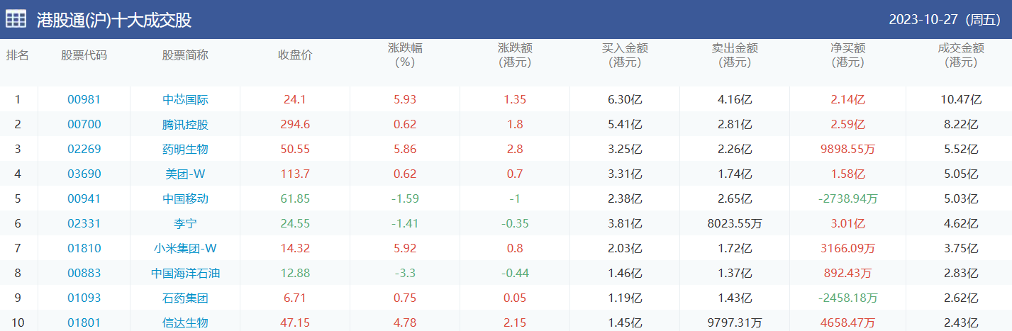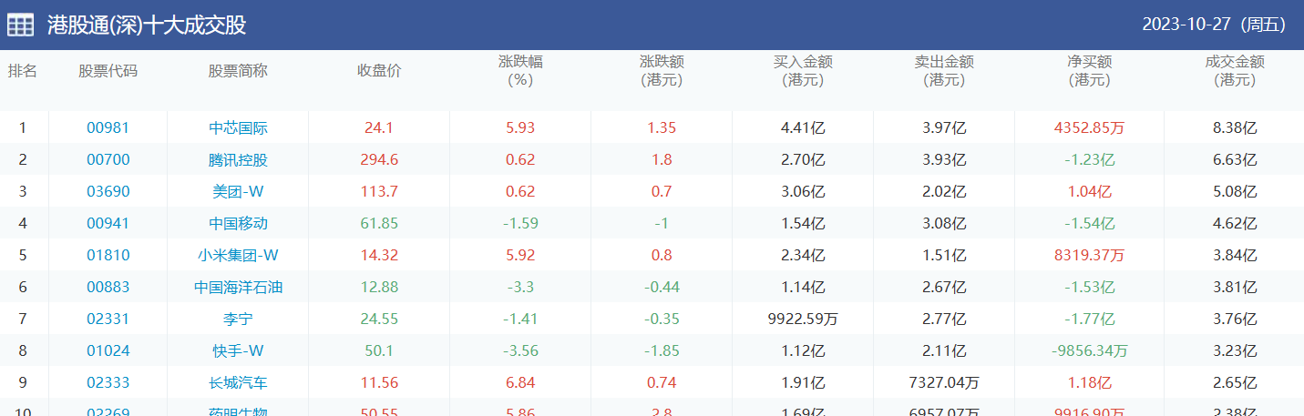 亚汇网实时数据统计:截至10月30日收盘,中芯国际、腾讯控股、药明生物位居港股通(沪)成交前三,中芯国际、腾讯控股、美团-w位居股通(深)成交前三。