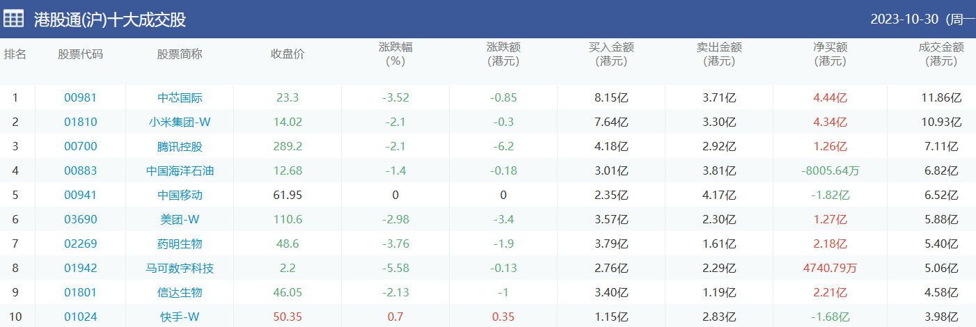 亚汇网实时数据统计:截至10月31日收盘,中芯国际、小米集团-w、腾讯控股位居港股通(沪)成交前三,中芯国际、美团-w、腾讯控股位居股通(深)成交前三。