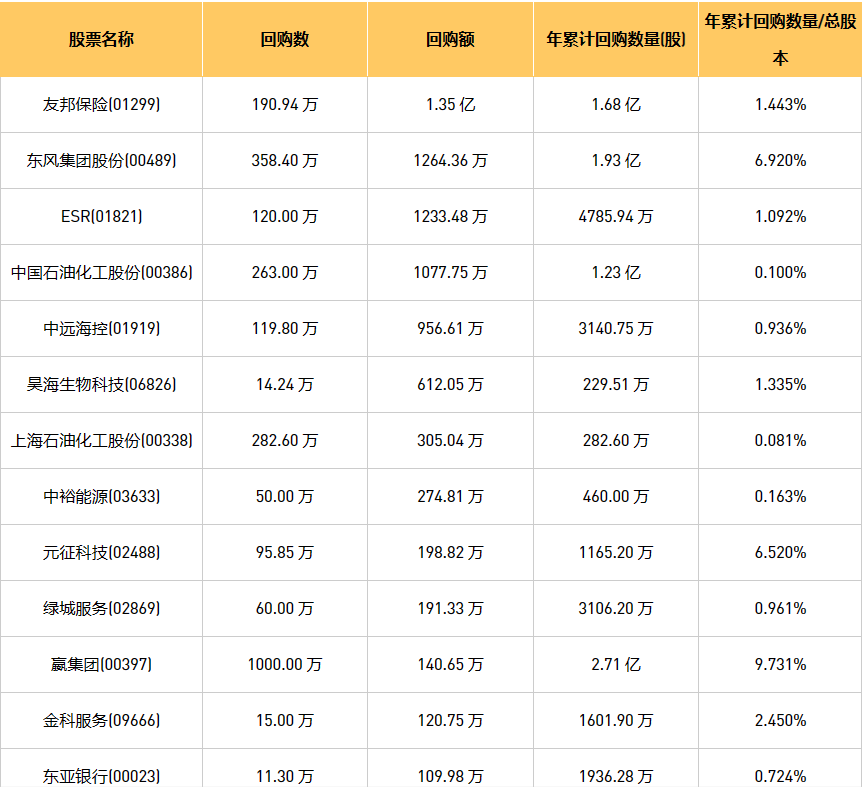 11月6日港股回购概况:中国淀粉(03838)、摩比发展(00947)、首佳科技(00103)、绿城服务(02869)、友邦保险(01299)、东亚银行(00023)、东风集团股份(00489)、希玛眼科(03309)、亿胜生物科技(01061)、中国石油化工股份(00386)、昊海生物科技(06826)、清科创业(01945)、创胜集团-B(06628)、歌礼制药-B(01672)、天福(06868)、中远海控(0)、协合新能源(00182)、VESYNC(02148)、中裕能源(03633)、嬴集团(00397)、旭日企业(00393)、ESR(01821)、美因基因(06667)、上海石油化工股份(00338)、赛晶科技(00580)、海伦司(09869)、金科服务(09666)、中电光谷(00798)、元征科技(02488)、科联系统(00046)、康圣环球(09960)于2023年11月3日进行了回购。其中,回购金额最大的为友邦保险(01299),回购数量190.94 万,回购金额1.35 亿元。