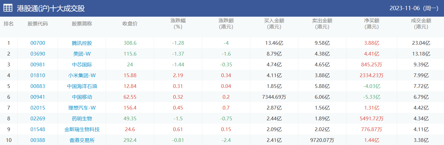 亚汇网实时数据统计:截至11月7日收盘,腾讯控股、美团-w、中芯国际位居港股通(沪)成交前三,腾讯控股、美团-w、药明生物位居股通(深)成交前三。