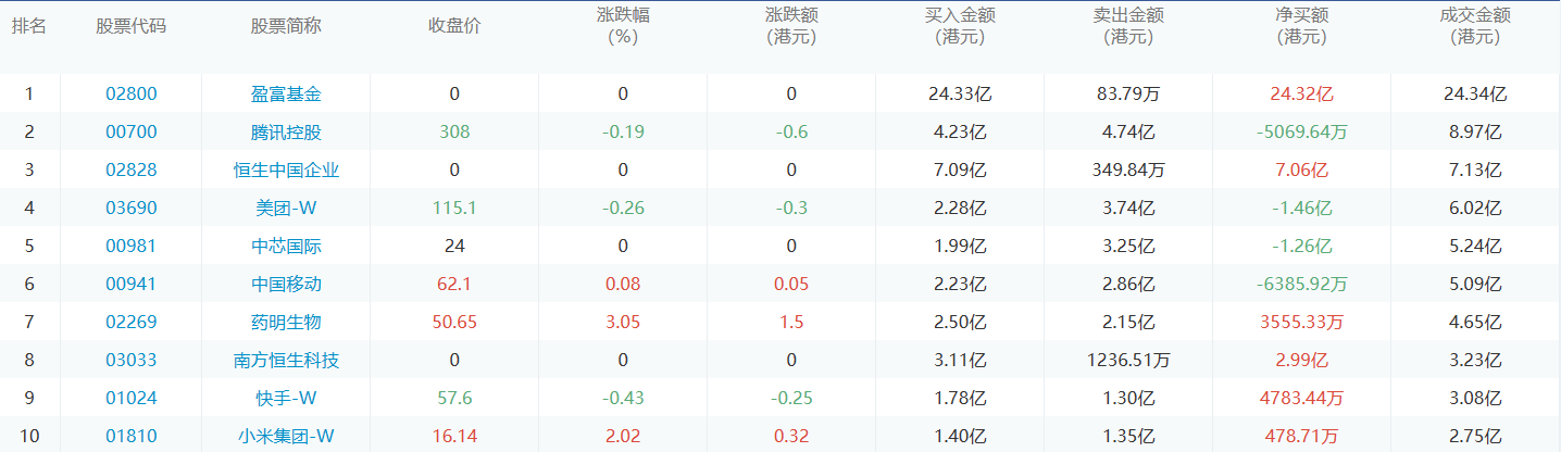亚汇网11月8日港股通数据统计显示:盈富基金净买入额居首,达24.33亿港元,腾讯控股净卖出额居第一位。
