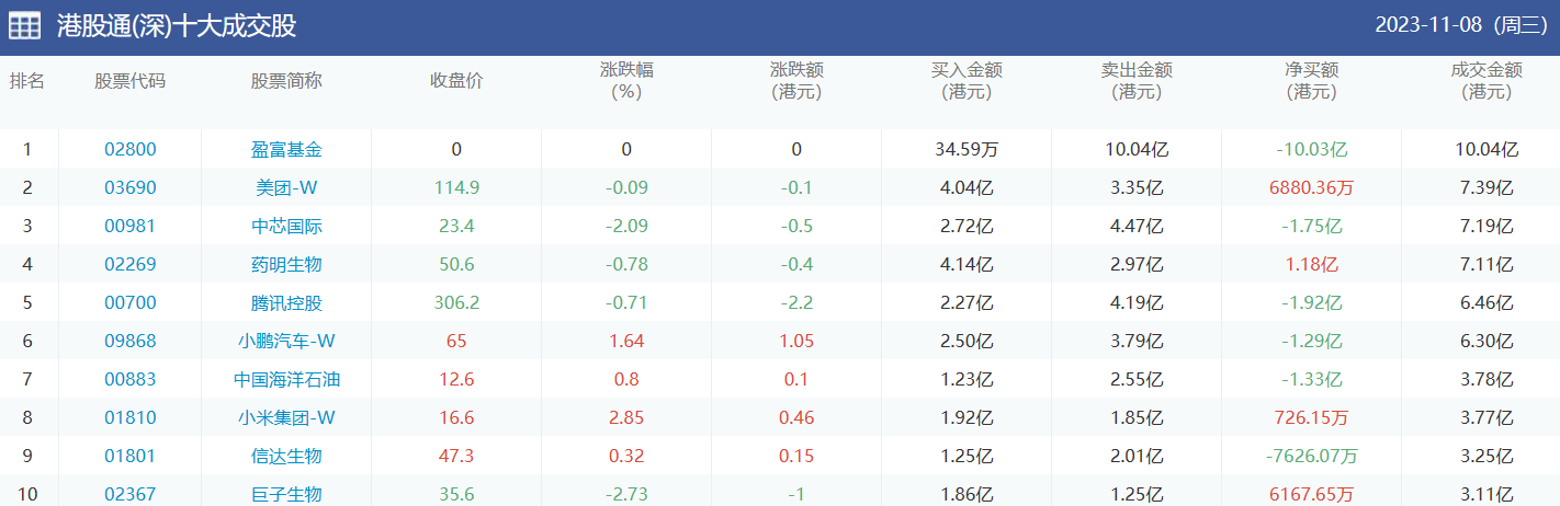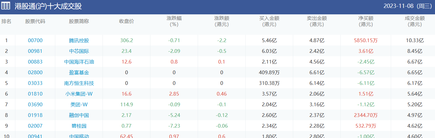 亚汇网实时数据统计:截至11月9日收盘,腾讯控股、中芯国际、中国海洋石油位居港股通(沪)成交前三,盈富基金、美团-w、中芯国际位居股通(深)成交前三。