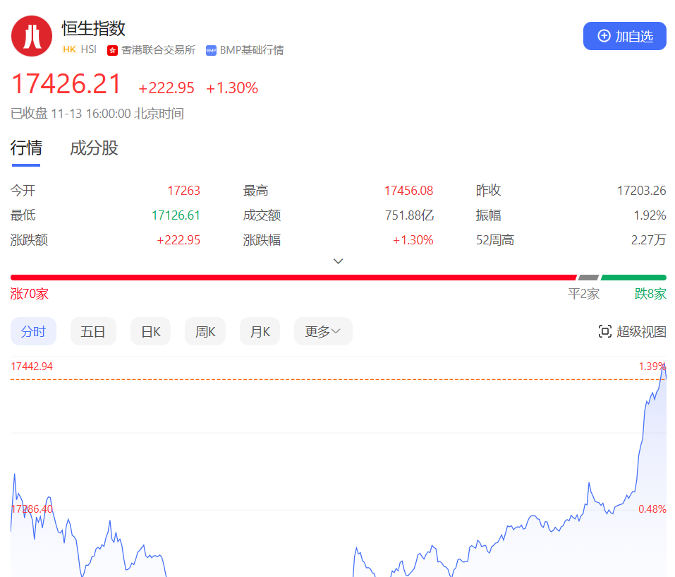 香港恒生指数开盘涨0.35%,三大指数早盘集体高开,随即震荡下挫,午后小幅回暖,尾盘则进一步拉升走高。截止收盘,恒生指数涨1.3%或222.95点,报17426.21点,全日成交额751.88亿港元;恒生国企指数涨1.5%,报5989.1点;恒生科技指数涨2.28%,报3981.27点。