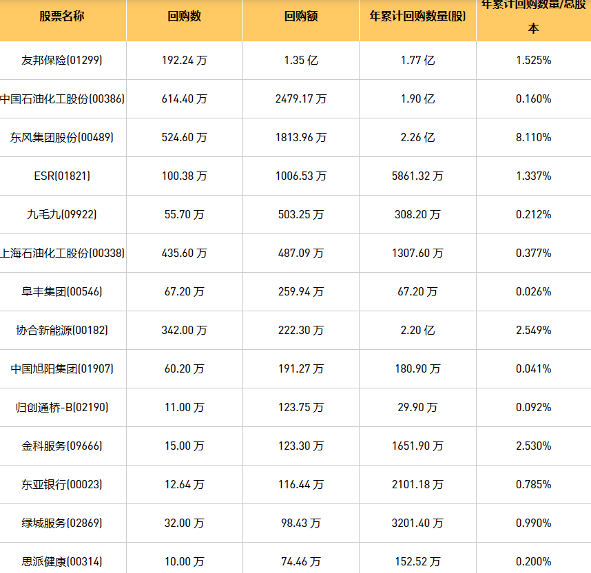 11月14日港股回购概况:摩比发展(00947)、科联系统(00046)、亿胜生物科技(01061)、安德利果汁(02218)、昊海生物科技(06826)、中国石油化工股份(00386)、清科创业(01945)、东亚银行(00023)、天福(06868)、友邦保险(01299)、绿城服务(02869)、金科服务(09666)、东风集团股份(00489)、上海石油化工股份(00338)、旭日企业(00393)、赛晶科技(00580)、归创通桥-B(02190)、九毛九(09922)、中国旭阳集团(01907)、德银天下(02418)、ESR(01821)、思派健康(00314)、协合新能源(00182)、海伦司(09869)、福森药业(01652)、康圣环球(09960)、阜丰集团(00546)于2023年11月13日进行了回购。其中,回购金额最大的为友邦保险(01299),回购数量192.24 万,回购金额1.35 亿元。