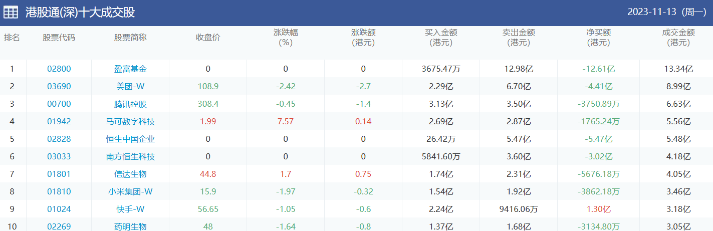 亚汇网实时数据统计:截至11月14日收盘,马克数字科技、美团-w、小米集团-w位居港股通(沪)成交前三,盈富基金、美团-w、腾讯控股位居股通(深)成交前三。