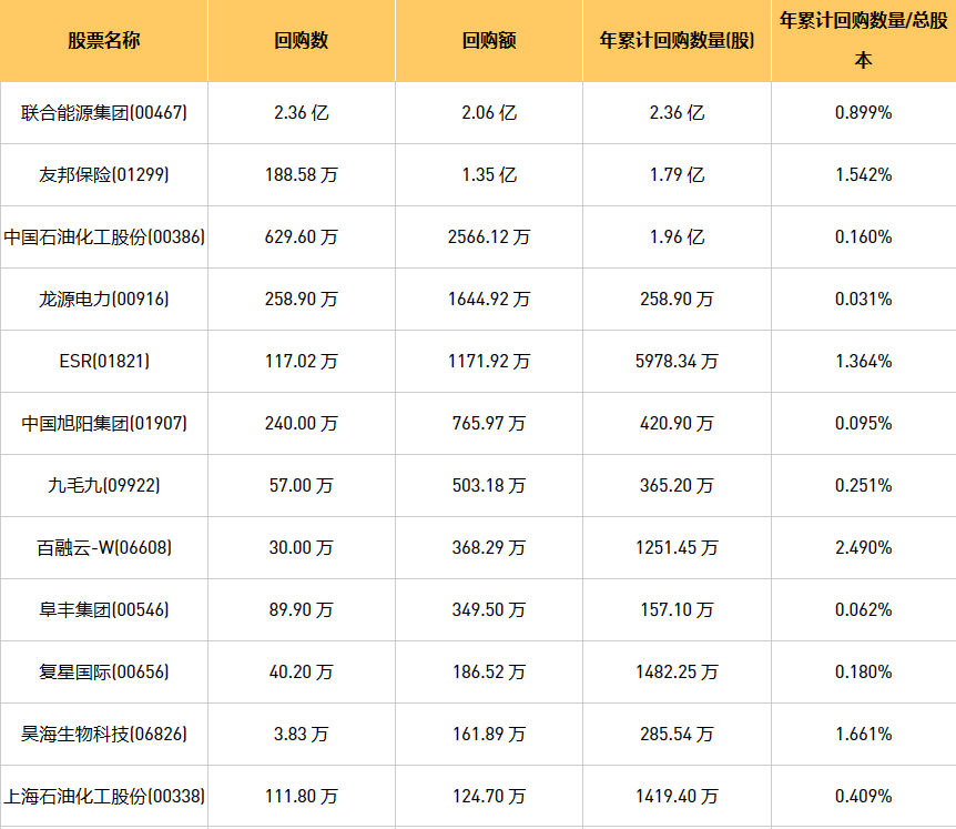 11月15日港股回购概况:科联系统(00046)、首佳科技(00103)、安德利果汁(02218)、天福(06868)、摩比发展(00947)、友邦保险(01299)、金科服务(09666)、清科创业(01945)、昊海生物科技(06826)、中国石油化工股份(00386)、东亚银行(00023)、美因基因(06667)、绿城服务(02869)、歌礼制药-B(01672)、九毛九(09922)、百融云-W(06608)、复星国际(00656)、创胜集团-B(06628)、德银天下(02418)、赛晶科技(00580)、上海石油化工股份(00338)、民银资本(01141)、未来发展控股(01259)、旭日企业(00393)、ESR(01821)、归创通桥-B(02190)、联合能源集团(00467)、诺诚健华(09969)、龙源电力(00916)、希玛眼科(03309)、协合新能源(00182)、IGG(00799)、中国旭阳集团(01907)、中电光谷(00798)、阜丰集团(00546)、福森药业(01652)、康圣环球(09960)于2023年11月14日进行了回购。其中,回购金额最大的为联合能源集团(00467),回购数量2.36 亿,回购金额2.06 亿元。