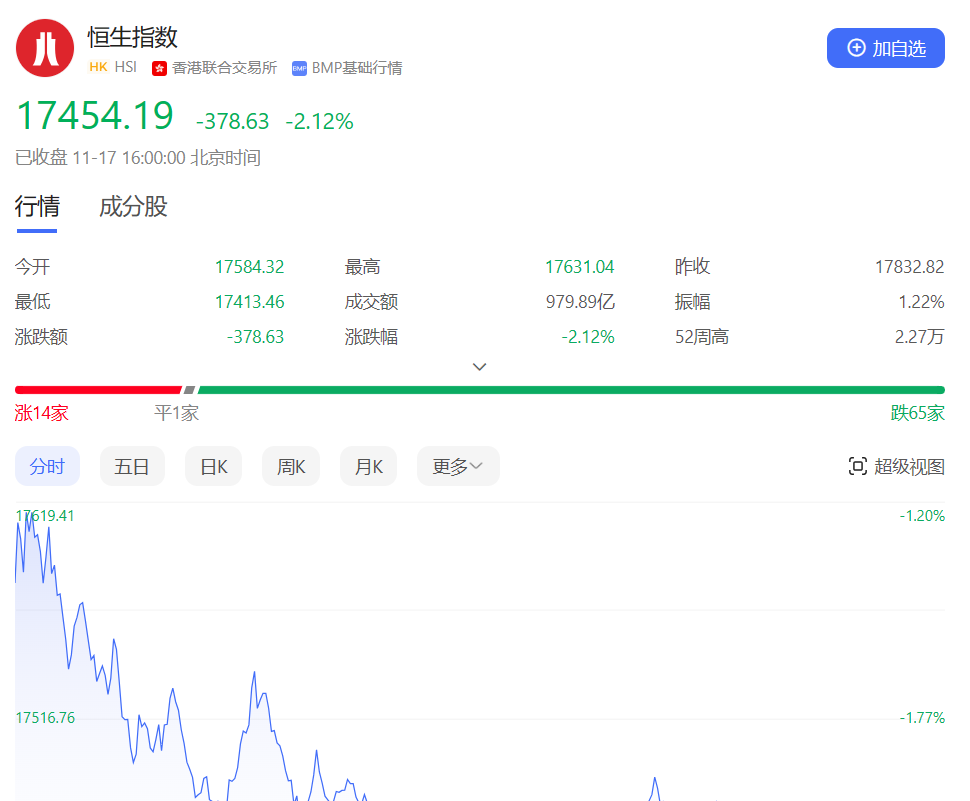 香港恒生指数开盘跌1.39%,三大指数早盘集体低开,全天弱势震荡,其中,恒科指跌穿4000点关口。截止收盘,恒生指数跌2.12%或378.63点,报17454.19点,本周累计涨1.46%,全日成交额979.89亿港元;恒生国企指数跌2.33%,报5974.47点;恒生科技指数跌1.72%,报3980.15点。