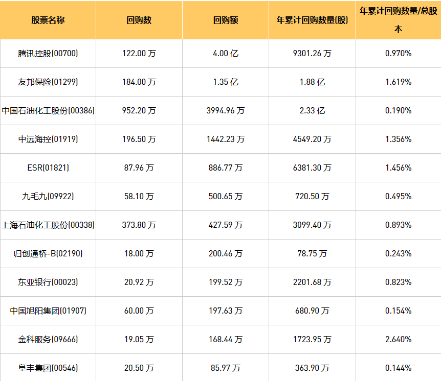 11月22日港股回购概况:中国淀粉(03838)、摩比发展(00947)、亿胜生物科技(01061)、伟仕佳杰(00856)、天福(06868)、金利来集团(00533)、金科服务(09666)、清科创业(01945)、九毛九(09922)、东亚银行(00023)、中国石油化工股份(00386)、首佳科技(00103)、昊海生物科技(06826)、归创通桥-B(02190)、歌礼制药-B(01672)、绿城服务(02869)、上海石油化工股份(00338)、友邦保险(01299)、中远海控(0)、思考乐教育(01769)、腾讯控股(00700)、创胜集团-B(06628)、德银天下(02418)、赛晶科技(00580)、旭日企业(00393)、新鸿基公司(00086)、ESR(01821)、汇量科技(01860)、中国旭阳集团(01907)、康圣环球(09960)、阜丰集团(00546)、中电光谷(00798)、福森药业(01652)于2023年11月21日进行了回购。其中,回购金额最大的为腾讯控股(00700),回购数量122.00 万,回购金额4.00 亿元。
