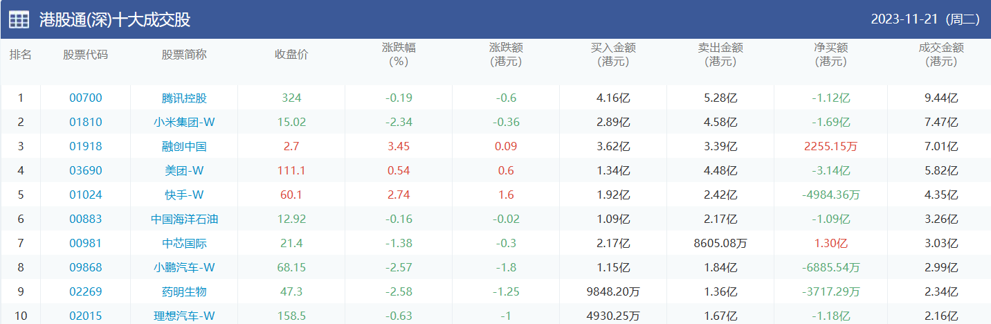 亚汇网实时数据统计:截至11月22日收盘,腾讯控股、小米集团-w、融创中国位居港股通(沪)成交前三,腾讯控股、小米集团-w、融创中国位居股通(深)成交前三。