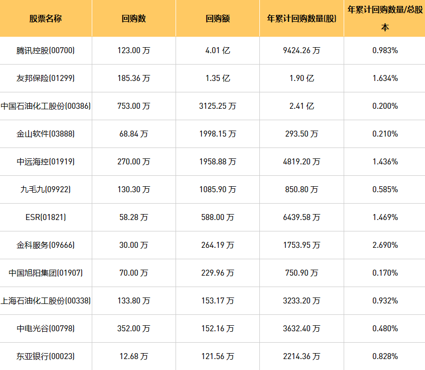 11月23日港股回购概况:中国淀粉(03838)、安德利果汁(02218)、摩比发展(00947)、旭辉永升服务(01995)、金利来集团(00533)、亿胜生物科技(01061)、新鸿基公司(00086)、清科创业(01945)、中国旭阳集团(01907)、九毛九(09922)、腾讯控股(00700)、绿城服务(02869)、友邦保险(01299)、天福(06868)、归创通桥-B(02190)、中国石油化工股份(00386)、首佳科技(00103)、东亚银行(00023)、亚洲金融(00662)、金科服务(09666)、金邦达宝嘉(03315)、中远海控(0)、汇量科技(01860)、赛晶科技(00580)、上海石油化工股份(00338)、歌礼制药-B(01672)、旭日企业(00393)、协合新能源(00182)、ESR(01821)、金山软件(03888)、思考乐教育(01769)、阜丰集团(00546)、中电光谷(00798)、香港科技探索(01137)、康圣环球(09960)、德银天下(02418)于2023年11月22日进行了回购。其中,回购金额最大的为腾讯控股(00700),回购数量123.00 万,回购金额4.01 亿元。