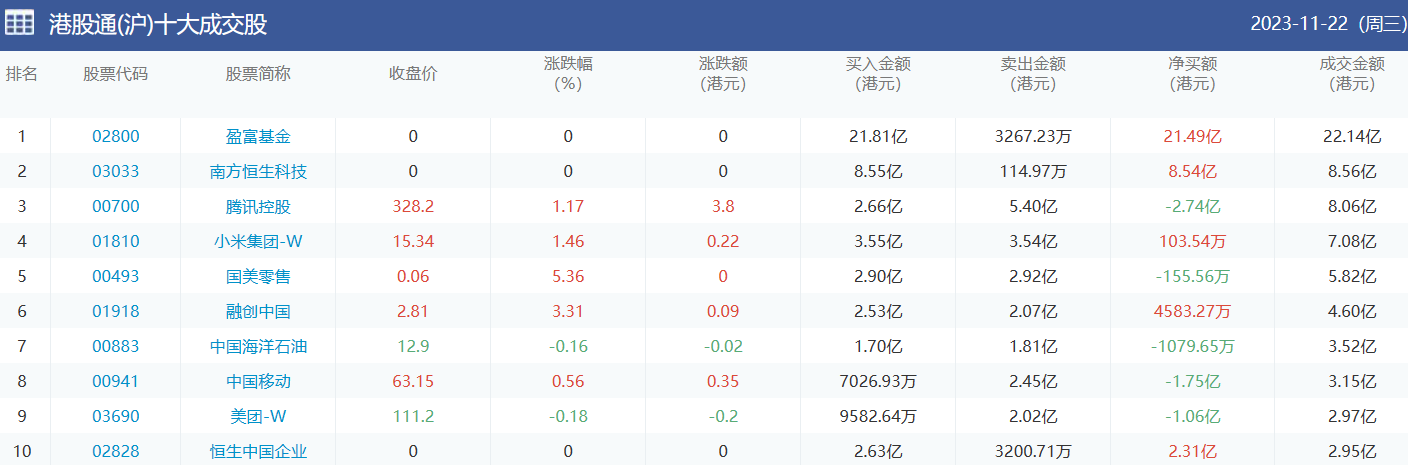 亚汇网实时数据统计:截至11月23日收盘,盈富基金、南方恒生科技、腾讯控股位居港股通(沪)成交前三,盈富基金、恒生中国企业、腾讯控股位居股通(深)成交前三。